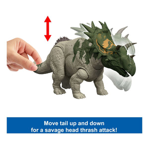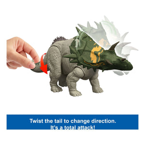 Get roaring and ferocious with this Wild Roar Spiclypeus inspired by Jurassic World Rebirth. It's a Total Attack kids can easily move the tail up and down on this dinosaur toy to activate a thrilling up and down head butt attack, accompanied by a savage roar, then twist the tail to change the direction to side to side!