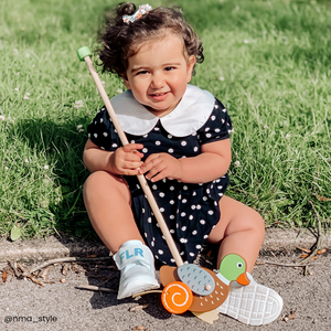 Balance and movement are at the forefront of this colourful Duck Push Along toy, as your little one pushes it across the floor holding the easy to grip handle. As your little one pushes and pulls the Duck around, indoors and out, its feet will flap on the floor providing entertainment for all! Features a sturdy wooden pole with an easy to grip handle. The Bigjigs Toys push alongs are a great way to encourage mobility, balance skills and an understanding of cause and effect. Other animal themed push alongs are available. Made from high quality, responsibly sourced materials. Conforms to current European safety standards.