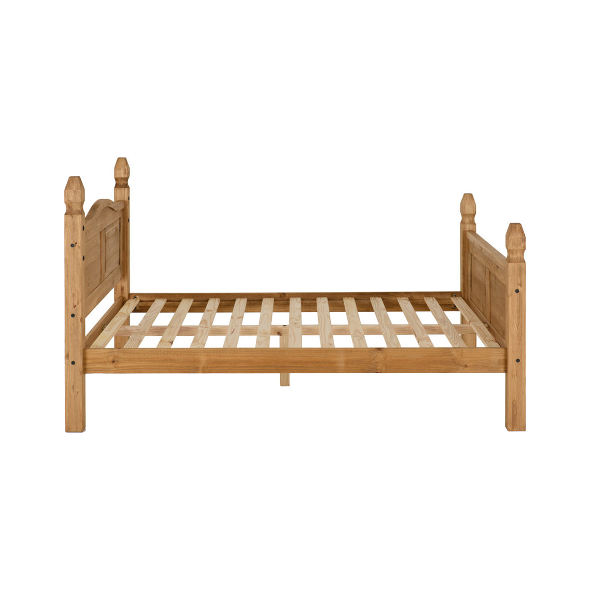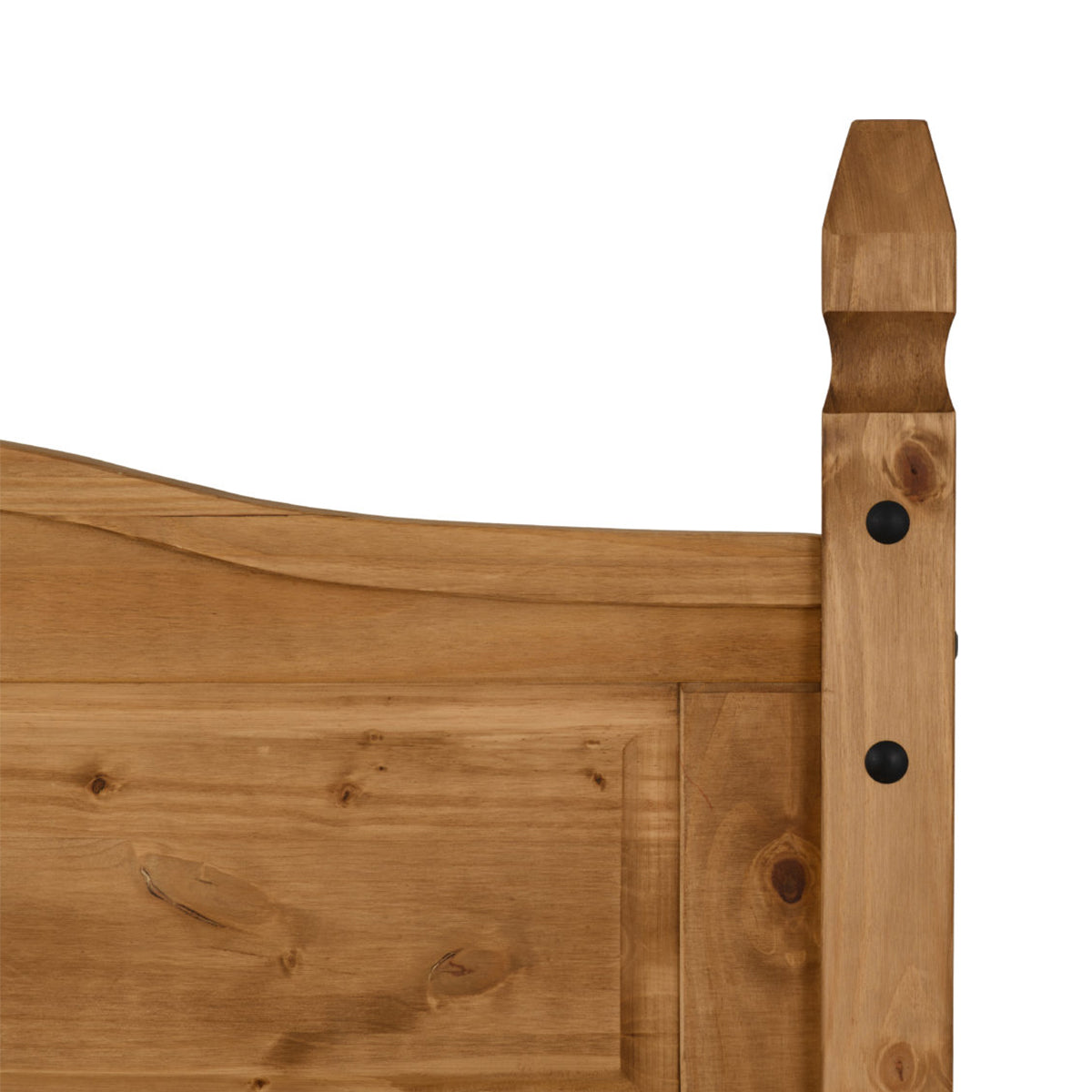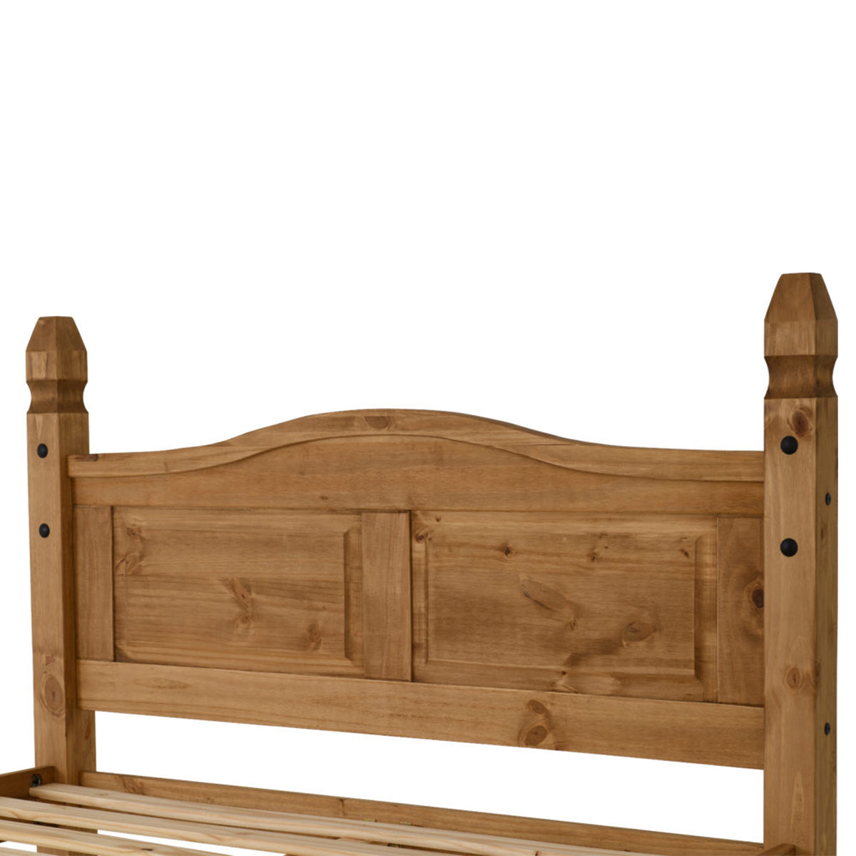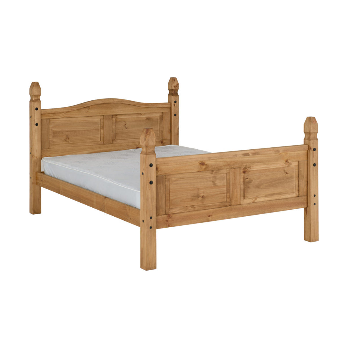 Styled with a Mexican influence this Corona 5Ft High End Bed has a warm, welcoming appearance, enhanced by the beautiful wood grain of the solid pine. Touches of Black Metal strongly contrast the natural tones of the pine, enforcing the rustic look.