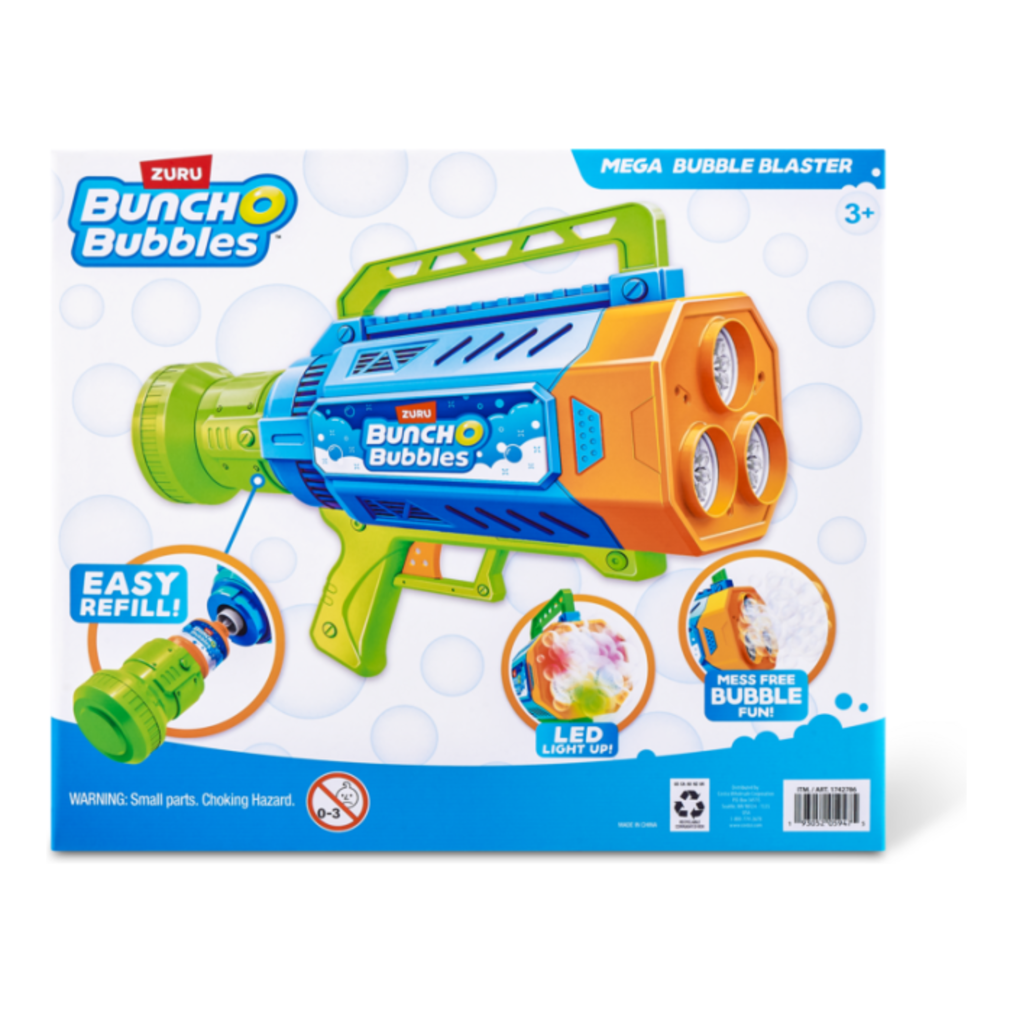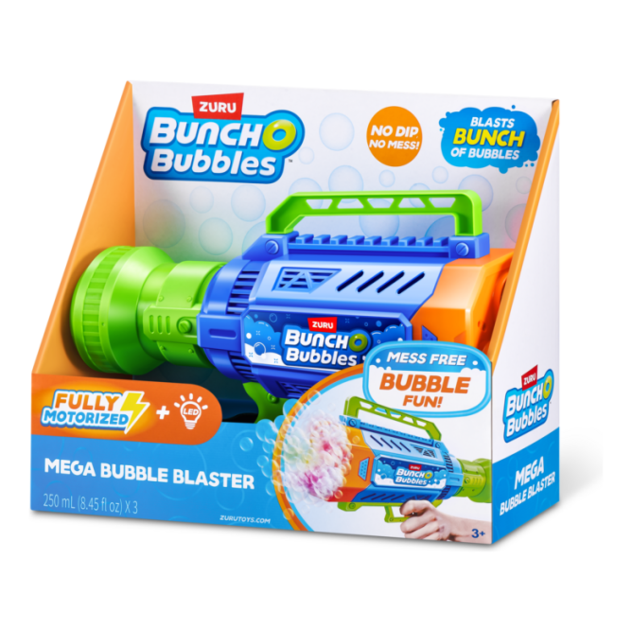 Blast millions of bubbles with the Bunch O Bubbles Motorized Mega Bubble Blaster! This no-dip, no-mess bubble blaster takes the fuss out of bubble fun—simply place the included bubble solution into the easy refill holder for a continuous flow of bubbles.