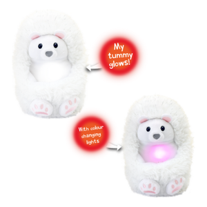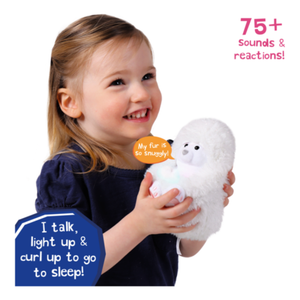 Meet Perry the Polar Bear, your cuddly new Arctic friend! Soft, snuggly, and full of personality, Perry loves to interact with you. Pat his head and hear him giggle, make cute sounds, and say adorable phrases. Rub his nose to see his magical light-up tummy, or tickle his tummy to watch him curl up and drift off to sleep. With over 50 sounds and reactions, Perry encourages interaction, pattern recognition, and imaginative play while teaching nurturing behaviour.