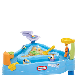 The Bluey-themed accessories encourage imaginative play, and the sand and water setup create a fun sensory experience for children. Splash around with the “Lazy River,” dig and build in the sand, or send Bluey on a ride down the cascading pools! When playtime is over, simply drain, plug, and cover the table with the included covering to allow for clean and easy storage.