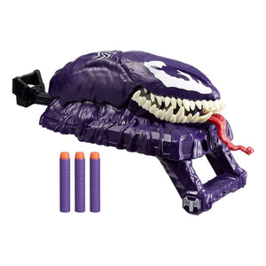 Worlds collide with the Marvel Spider-Man Venomversus, where Spider-Man and the Avengers have powered up with Venom’s symbiote powers to battle Venom and all the Venomized villains! This Marvel roleplay toy features classic black-and-white Venom deco and design, inspired by the Marvel comics. Load one of the included NERF darts into the blaster’s mouth, then press the Venom head down to close the mouth. Ready to blast into action? Pull the back on the rear handle to open Venom’s mouth, complete with stretchy “saliva” effect, and press the button on the handle to blast darts at the bad guys! Look for more Marvel Spider-Man VenomVersus toys to collect, build a web slinger collection, or give as cool Marvel Spider-Man gifts, including action figures and roleplay gear. (Each sold separately. Subject to availability.)