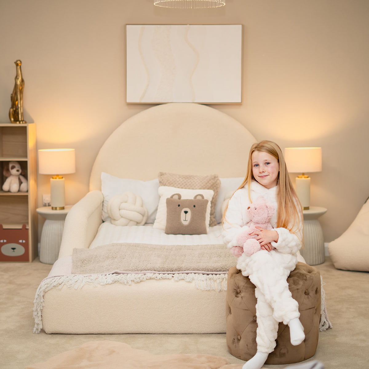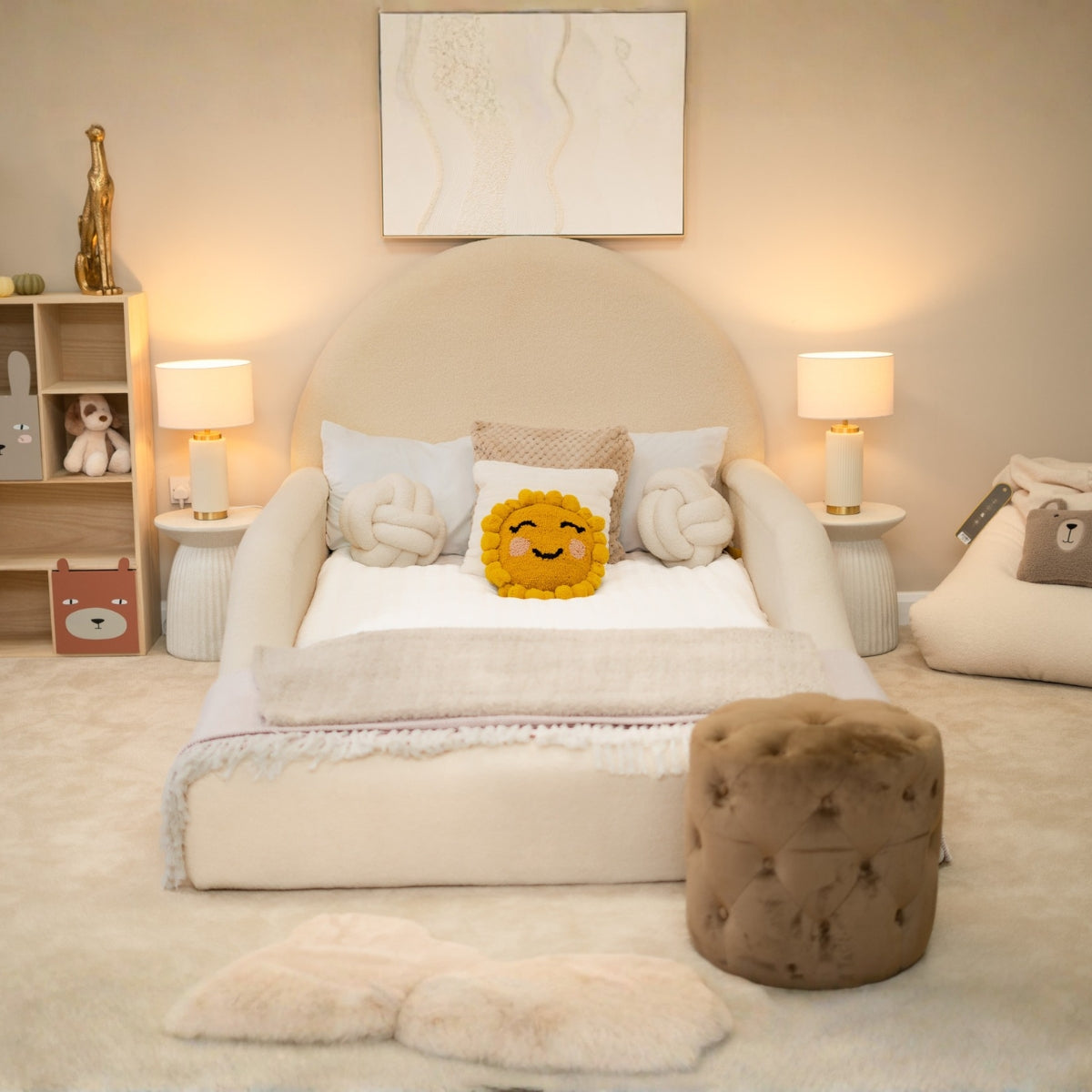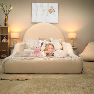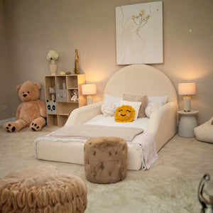Welcome sweet dreams with the Archway Dream Bed. Inspired by gentle curves and ultimate comfort, this bed features a soft, arching headboard that creates a secure, cozy space for your little one. The low-profile design is perfect for easy in-and-out access, and the fully padded frame ensures safety. This timeless piece in a calming, neutral tone is designed to be the centerpiece of a serene and stylish bedroom.