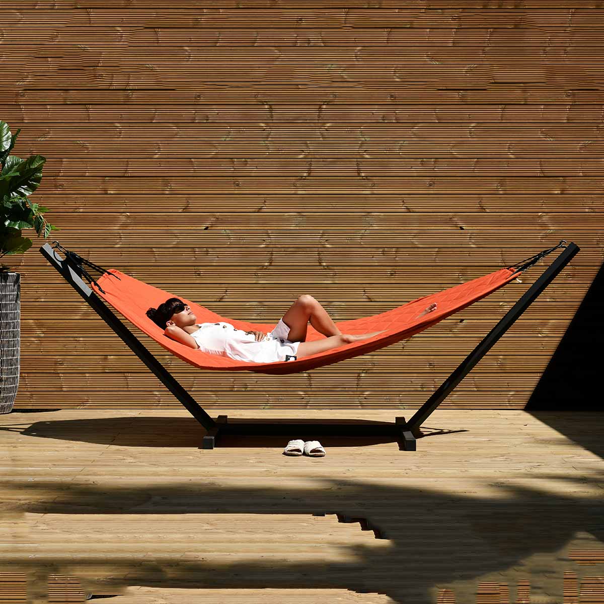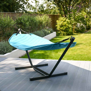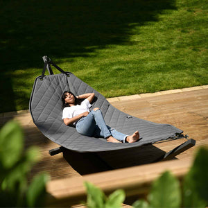 Who doesn’t love the thought of drifting asleep on an ever-so-gently swaying hammock? We certainly do. That’s why we applied our legendary bean bag know-how to creating this sumptuous relaxation piece. It’s crafted from our super-soft yet durable quilted fabric. And supported by an ultra-stable base in lightweight tubular steel that’s easily erected and neatly folded away in no time.