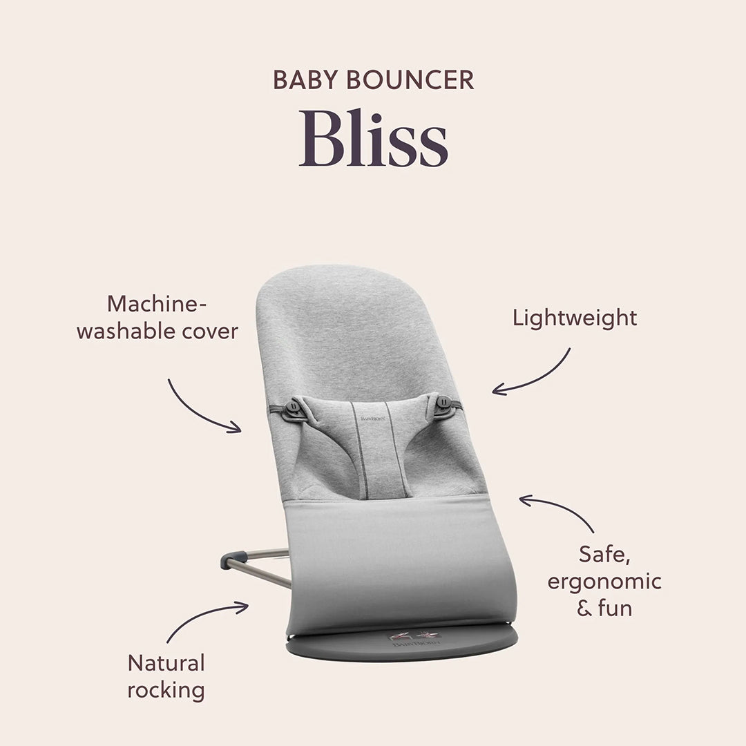 BabyBjorn Bouncer Bliss is our classic, award-winning baby bouncer in a new design. Bouncer Bliss gives your baby a cozy place to rest and play. The ergonomically shaped seat provides proper support to your baby's back, neck and head. The gentle, natural bouncing motion is controlled by you or your baby's movements.