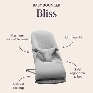 Bouncer Bliss is a lightweight and handy baby bouncer with natural rocking that makes life with young children easier and more enjoyable.