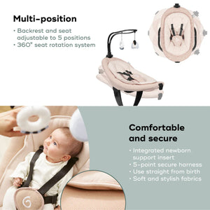 360° Rotating Seat: Keep your baby engaged with their surroundings and facilitate interaction by easily rotating the seat to any position. This allows your baby to observe and participate in family life without needing to move the entire swing.