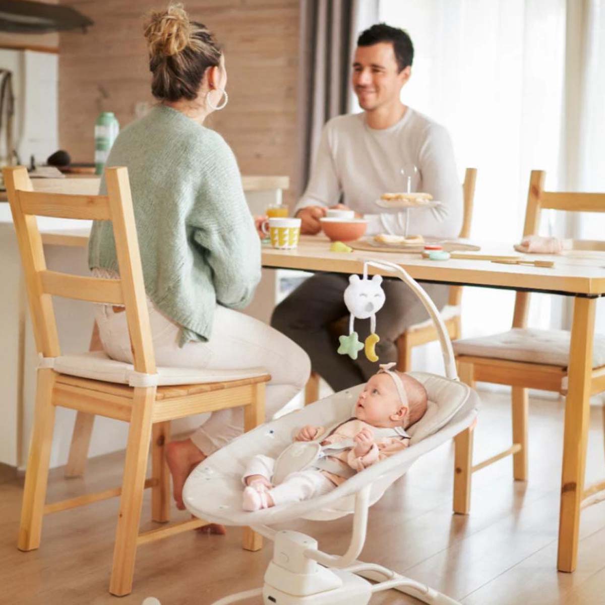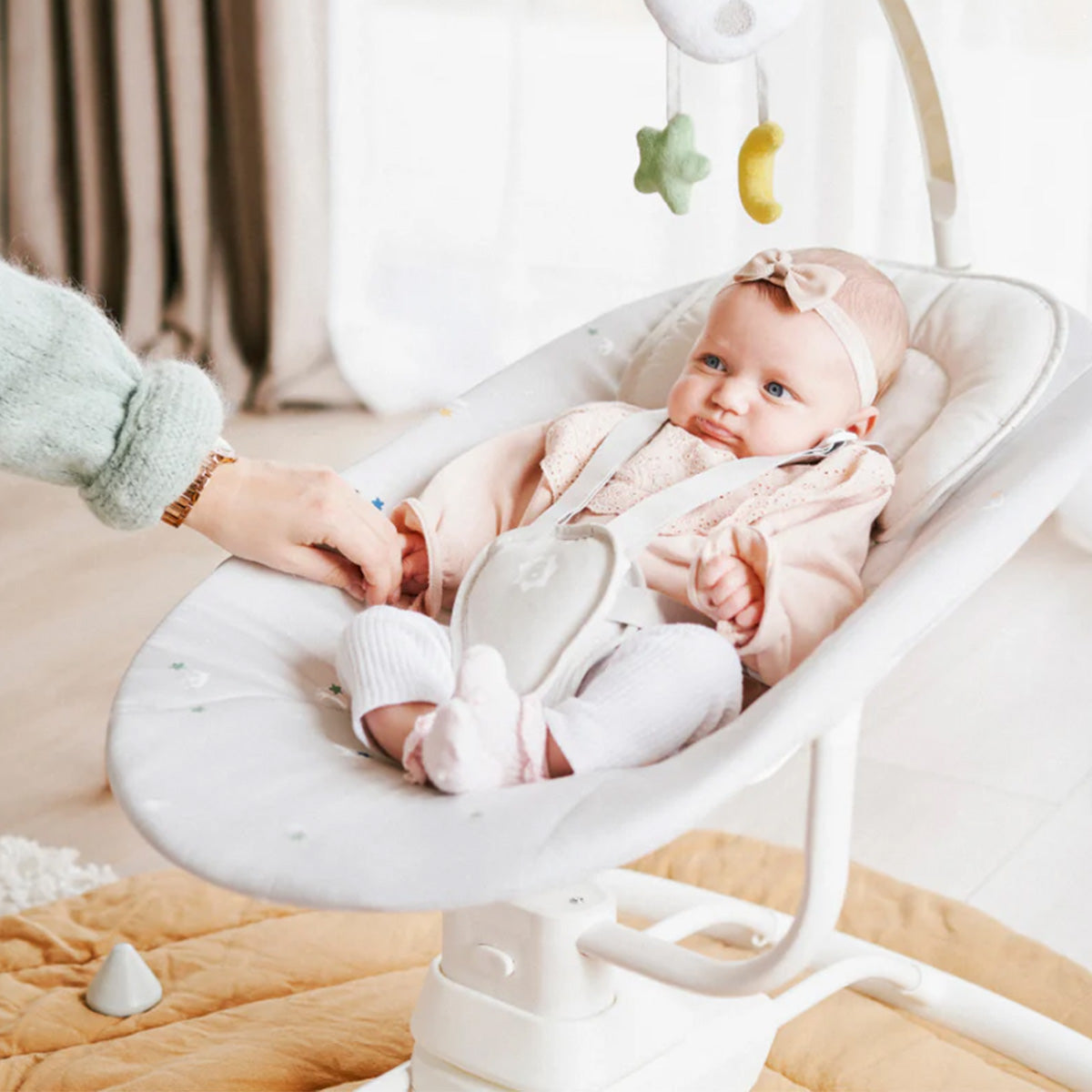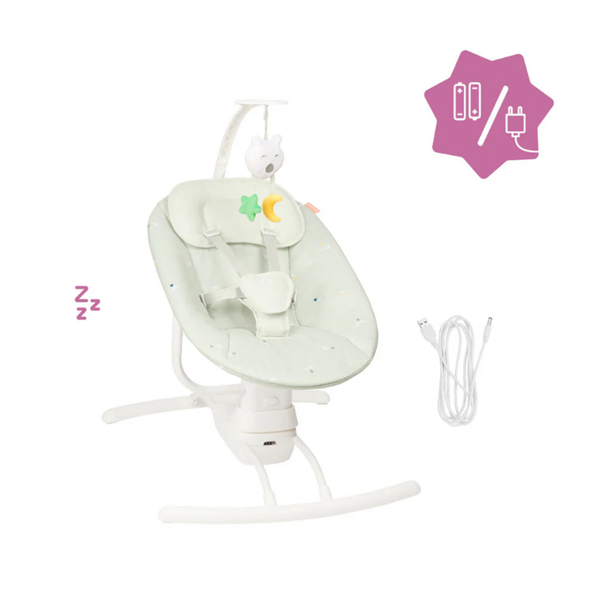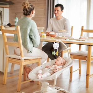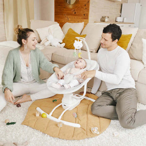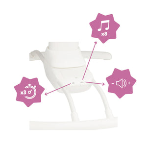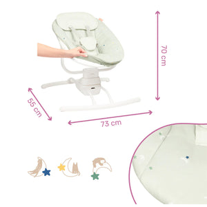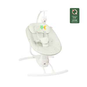 The Babymoov Swoon Motion is a comfortable, motorised baby swing that replicates the soothing movements of a parent's arms. It features three swing speeds, a supportive headrest, and an adjustable play arch with melodies to keep babies entertained. The swing is suitable from birth, has a dual power supply (battery or mains), and features a removable, machine-washable cover.