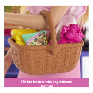 Bring everyday adventures to life with the Barbie Malibu Shopping Playset! Inspired by the movie Barbie and Teresa: Recipe for Friendship, kids can join Barbie “Malibu” on a fun trip to the market. The colourful market stand features shelves for displaying food and drink, and 11 themed accessories like a shopping basket, produce crate, and card scanner let imaginations run wild. Barbie “Malibu” doll wears a cute pink dress with ruffles and white sneakers, ready for her shopping adventure. Dolls cannot stand alone. Colors and decorations may vary.