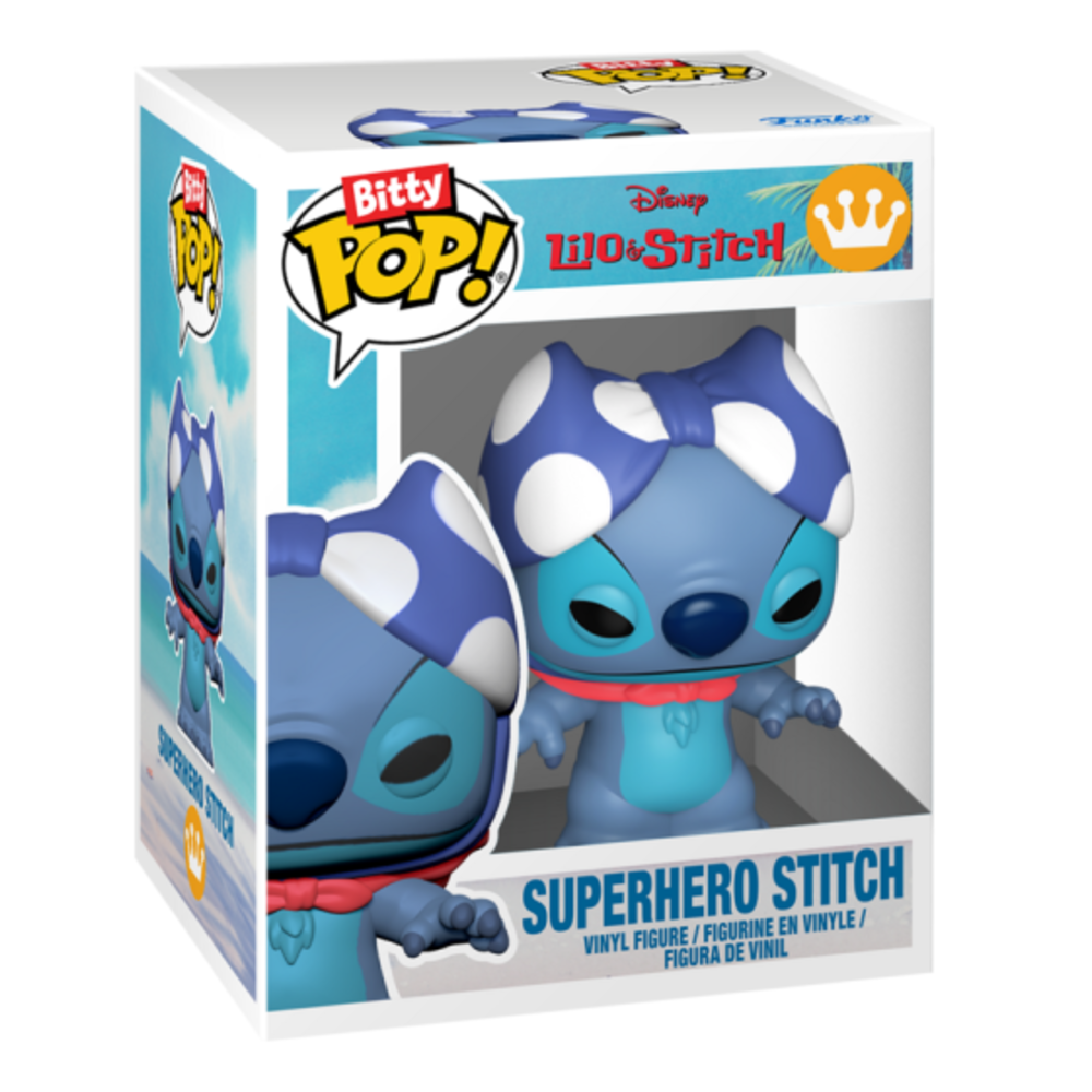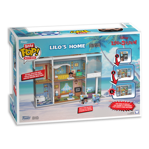 Expand your Disney Lilo & Stitch collection with the Bitty POP! Bitty Box Lilo’s Home! This collectible set includes Bitty POP! Lilo with Scrump and Bitty POP! Superhero Stitch, displayed in a hard acrylic case that opens to reveal Lilo’s iconic home. Perfect for display or mixing with other Bitty POP! figures, this collectible is both charming and detailed.