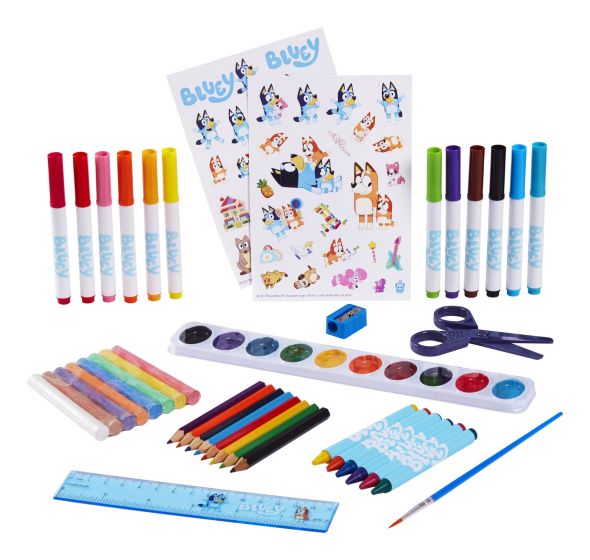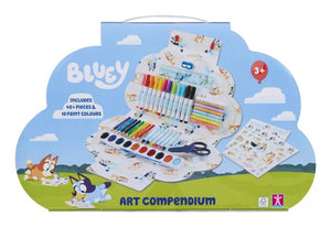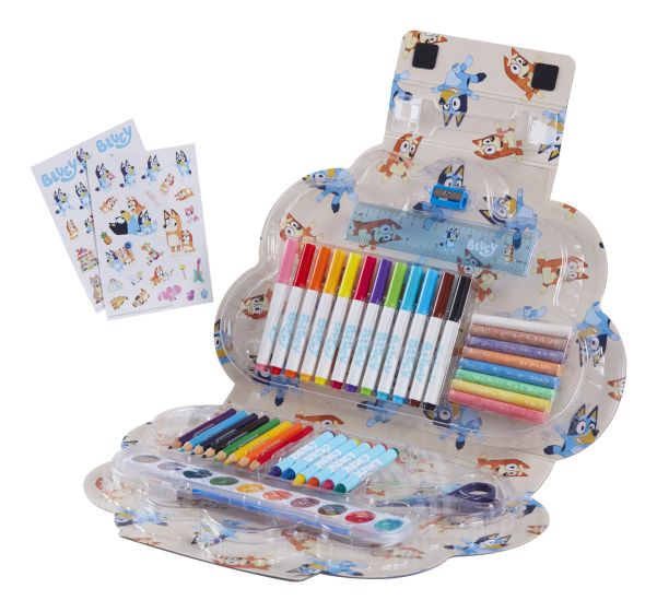 Have lots of creative fun with the Bluey Art Compendium, contains a host of art supplies and stationery. Everything stores inside the lovely cloud shaped carry case with handle, which features authentic Bluey styling. Perfect for encouraging creative play. Product features: Children will love using their Art kit to create their own Bluey masterpieces Your little pup will love this Bluey themed carry case complete with Bluey Branded stationary inside.