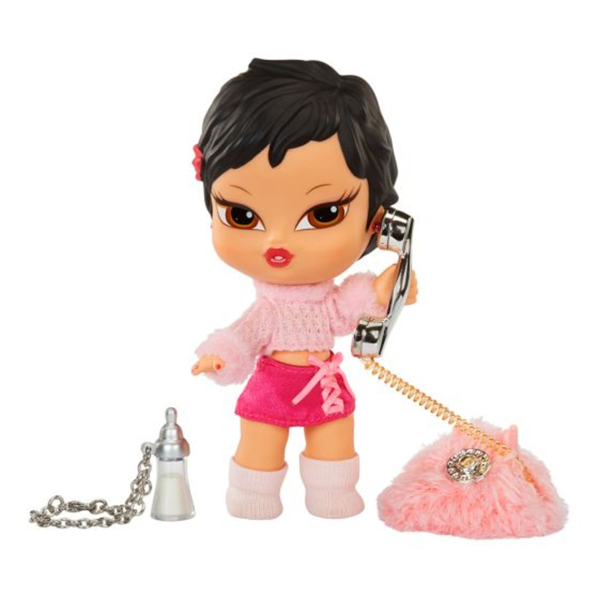 Jade is serving up cool style in a fuzzy pink sweater, silk-like skirt, and matching pink socks. Her short black hair is accessorised with a butterfly clip for the perfect playful touch. She also comes with her signature baby bottle necklace that doubles as a keychain for you, plus an adorable fuzzy telephone accessory to complete her runway look. With 5 points of articulation, Jade is ready to strike tons of poses on stage.