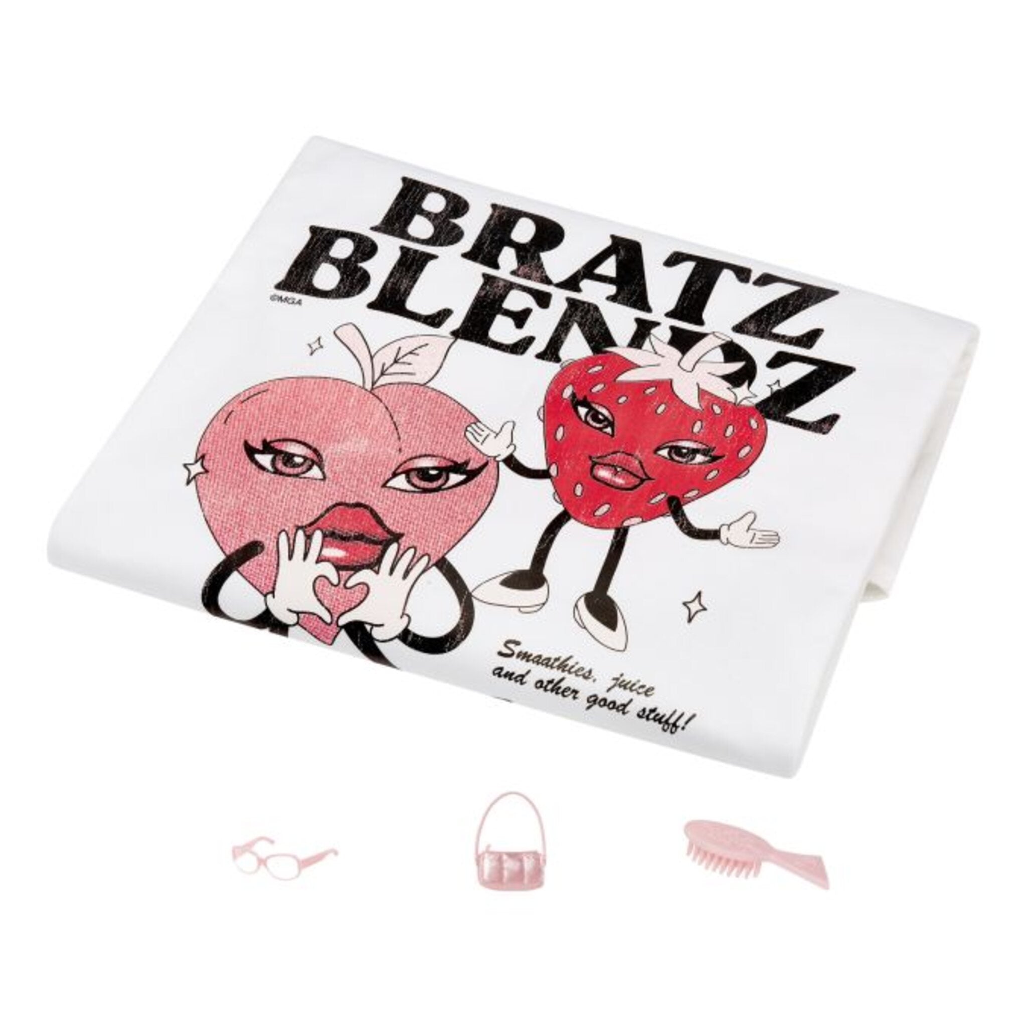 The Bratz are back with new stylin’ looks, and this time they’re sharing their fashion passion with you! Cloe comes with a matching shirt that you can customize to create your own unique style. She’s rocking a cropped, off-the-shoulder graphic tee paired with bowed-up denim pants, platform heels, a matching handbag, and stylish shades. Her hair is styled in high pigtails, and her soft-glam makeup with a pink lip completes her fashionable look.