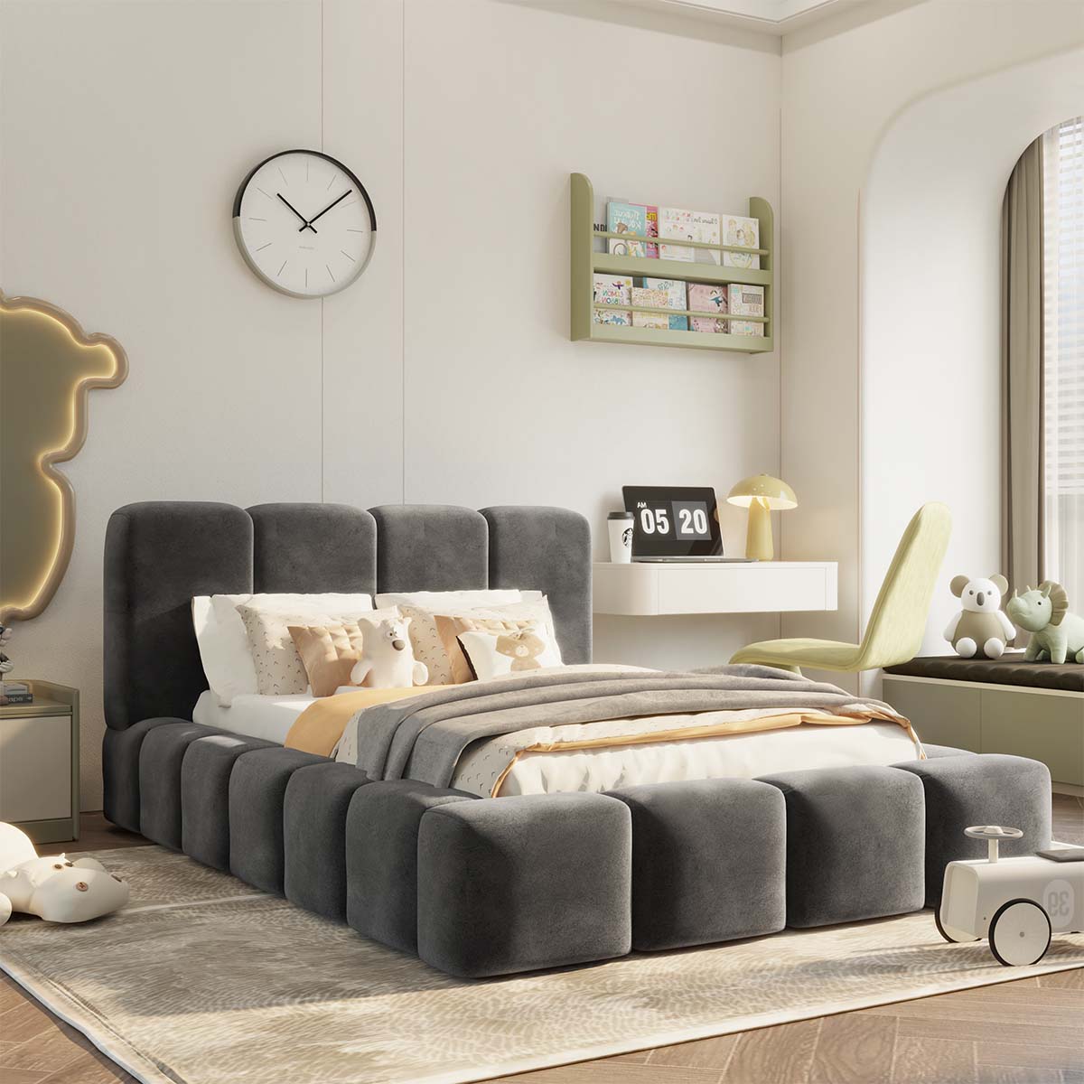 - Segmented playful headboard design