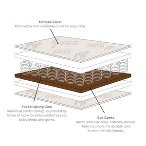 For eco-conscious parents, our Premium Bamboo Pocket Sprung Cot Bed Mattress pairs a machine washable bamboo cover with a pocket sprung core and organic coir layer for a breathable and firm surface for your baby’s first sleep space.