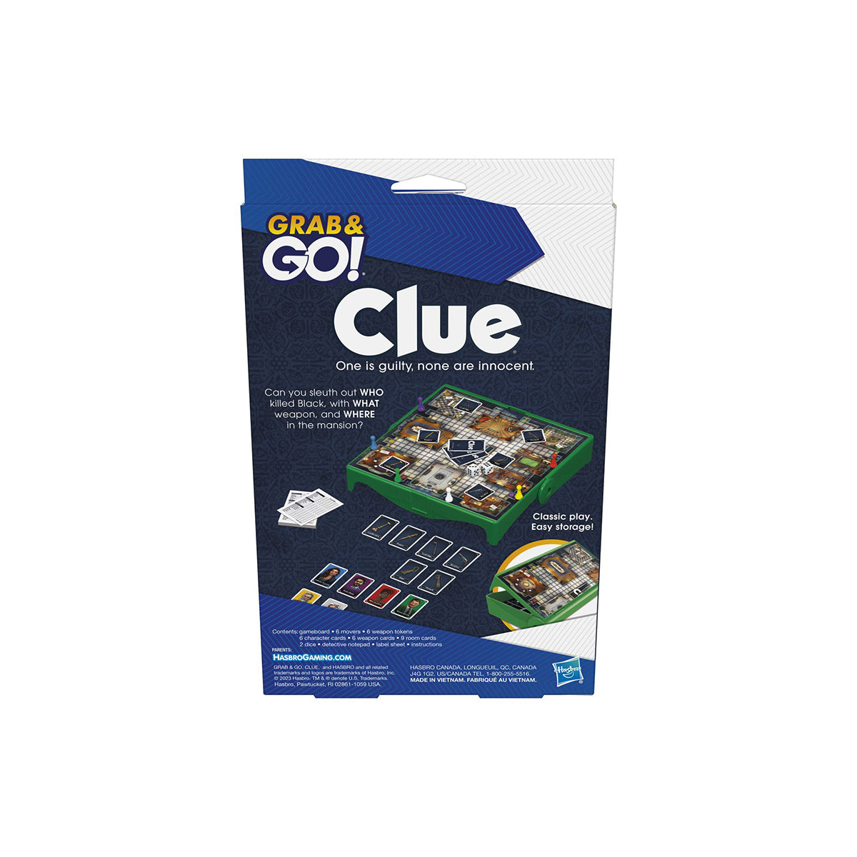 Super sleuths can keep track of the clues in their Detective Notebook and solve the case! When the case is solved, store all the cards and parts in the all-in-one game unit—until the next murder! For 3 to 6 players, ages 8 and up, this portable travel game is great for playing the Clue Grab and Go game just about anywhere. Hasbro Gaming and all related terms are trademarks of Hasbro.