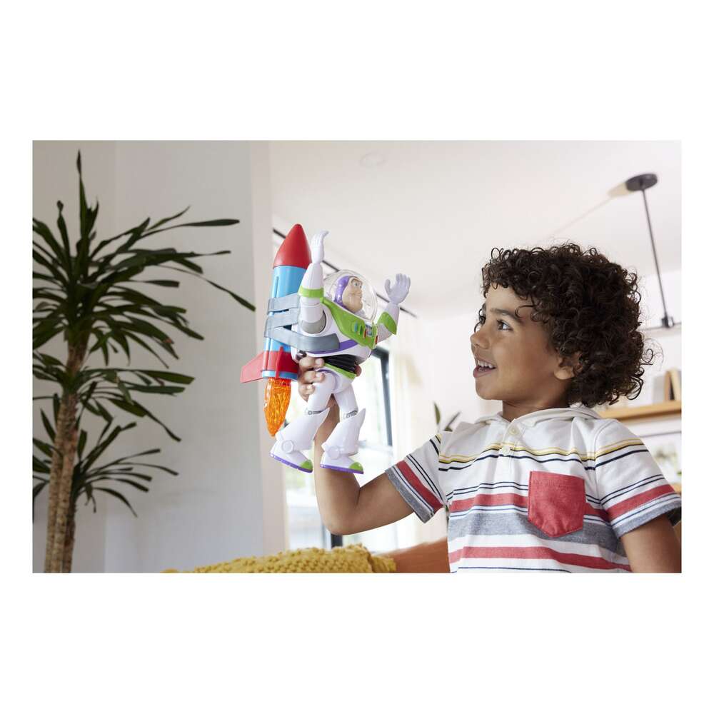This 10-inch tall Rocket Rescue Buzz action figure and rocket with 20+ movie phrases and rocket sounds is ready to take off on some oversized Toy Story adventures! The posable Buzz Lightyear appears in his signature Space Ranger suit with removable visor. The large rocket that straps to his back recalls the heart-tugging moving day scene where Buzz comes to Woody's rescue. The deployable 'flames' from the bottom of the rocket propel storytelling and have a manual reset. A button on the chest activates the phrases and sounds and the flame effect. Makes a great gift for fans 4 years and older. Colors and decorations may vary.
