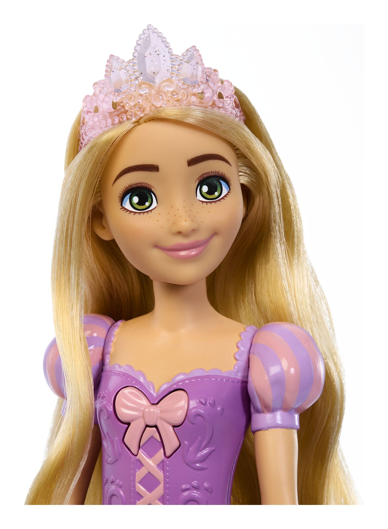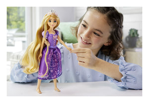 Inspired by the animated character from Disney's Tangled, this vibrant and creative Rapunzel doll is ready for adventure! Fans will love to join in as Rapunzel doll sings her signature song 'When Will My Life Begin?' Wearing her classic purple outfit, this Rapunzel doll sings with one press of a button. Kids can re-create their favourite movie moments or make up their own Rapunzel stories. Doll cannot stand alone. Colors and decorations may vary.