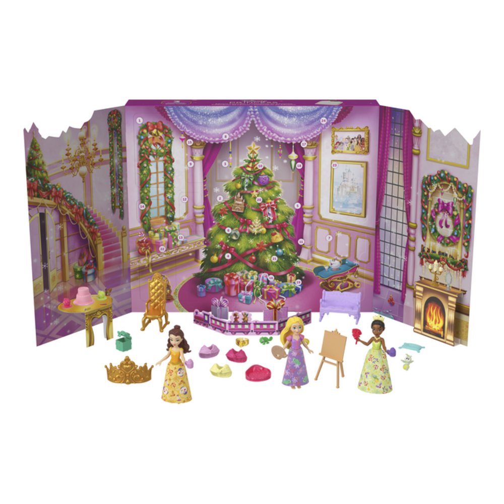 Countdown to the holidays with the Disney Princess Small Advent Calendar! This festive calendar includes 24 days of surprises, inspired by beloved Disney movies. Inside, fans will find three Disney Princess small dolls in holiday-themed fashions, three character friends, twenty-two accessories, and a pop-out festive scene to play with. Dolls cannot stand alone. Colors and decorations may vary.