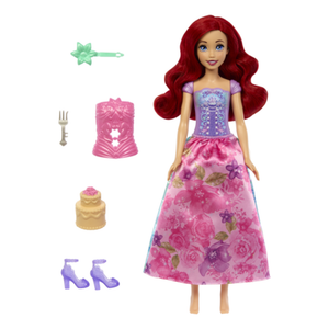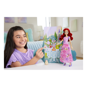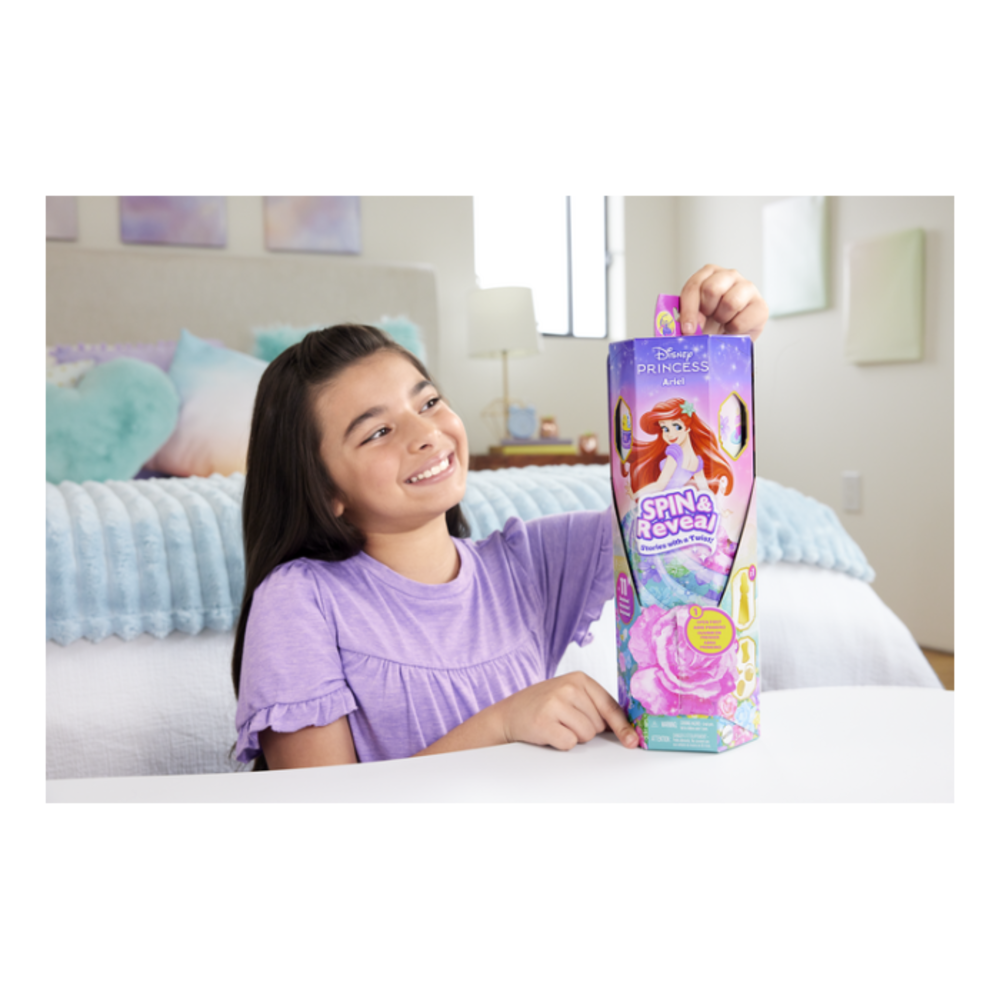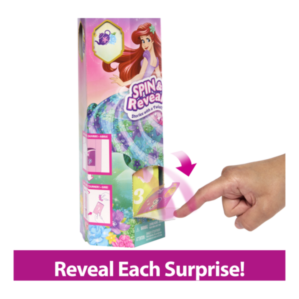 Experience a magical twist with Disney’s Ariel in the Spin & Reveal unboxing adventure! Kids open the flower to uncover a garden-party play scene with mystery silhouettes, then spin the package to reveal five mystery bags filled with accessories and stickers. The grand finale is a beautiful Ariel fashion doll in a floral outfit, complete with a reversible skirt and snap-on bodice for extended play. Use the decorated play scene as a backdrop for endless imaginative stories.