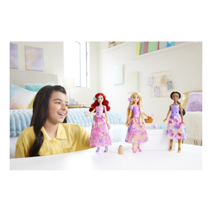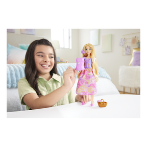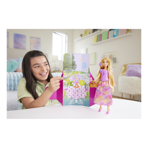 Bring the magic of Rapunzel to life with this Spin & Reveal unboxing experience! Kids start by opening the flower to uncover a garden-party play scene with mystery silhouettes, then spin the package to reveal five mystery bags filled with fashion accessories and stickers. The grand finale is a Rapunzel fashion doll in a floral outfit, complete with a reversible skirt and snap-on bodice. Decorate the play scene and let your imagination run wild with stories and adventures!