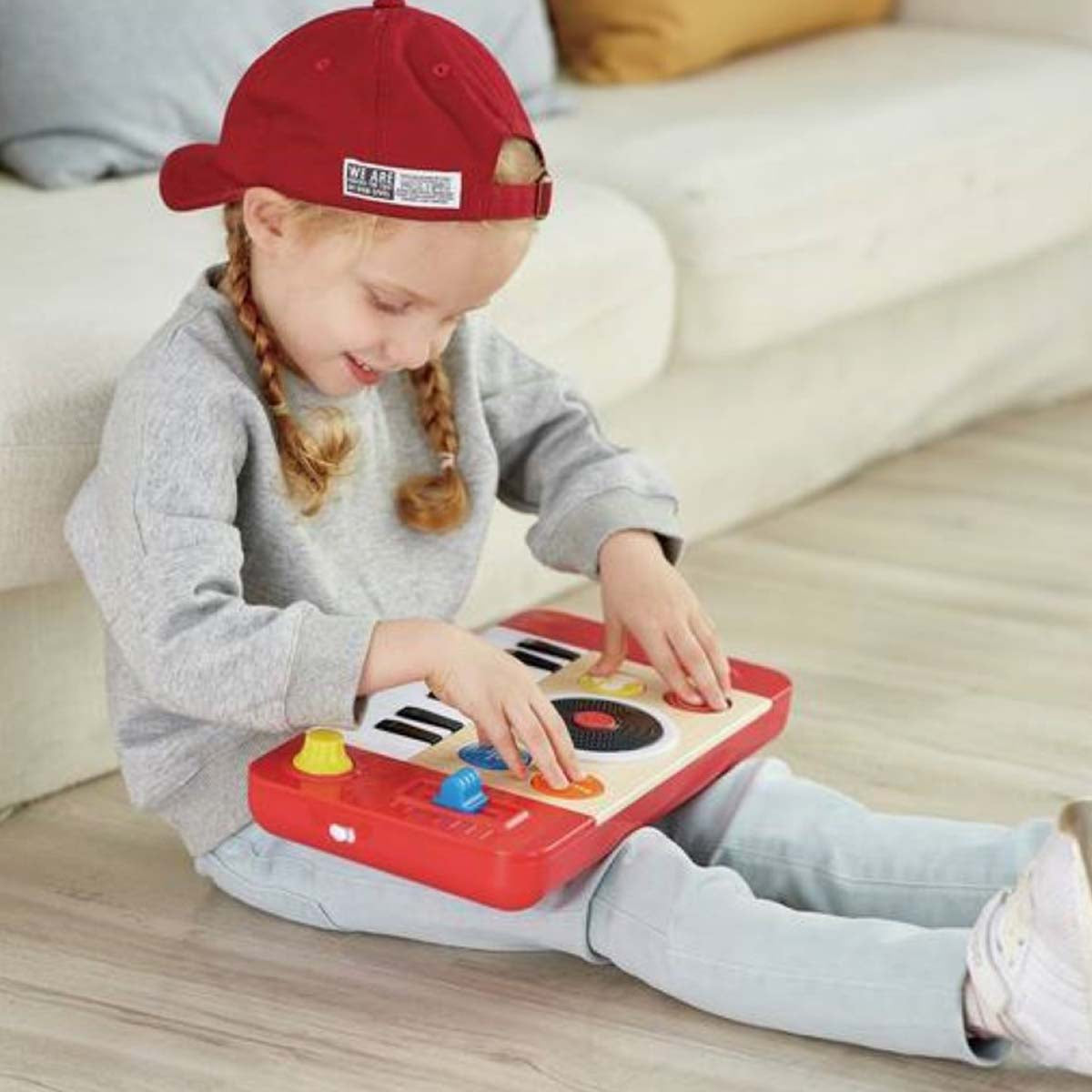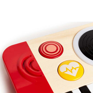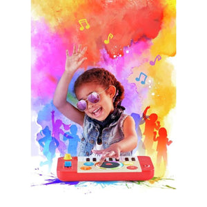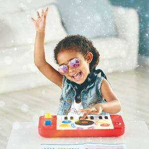 The versatile DJ Mix & Spin Studio develops musical learning at different ages. Toddlers can discover the joy of music at the touch of a button, but as they grow they can start learning to play the keyboard and discover how to mix tracks. The keyboard has four instrument sounds (piano, bass, organ and drum), and it comes with a music booklet with eight different songs, as well as musical alphabet stickers to put on the piano keys to help children learn the songs. The DJ Mix & Spin Studio will last for years and accompany your child’s growth and musical journey.