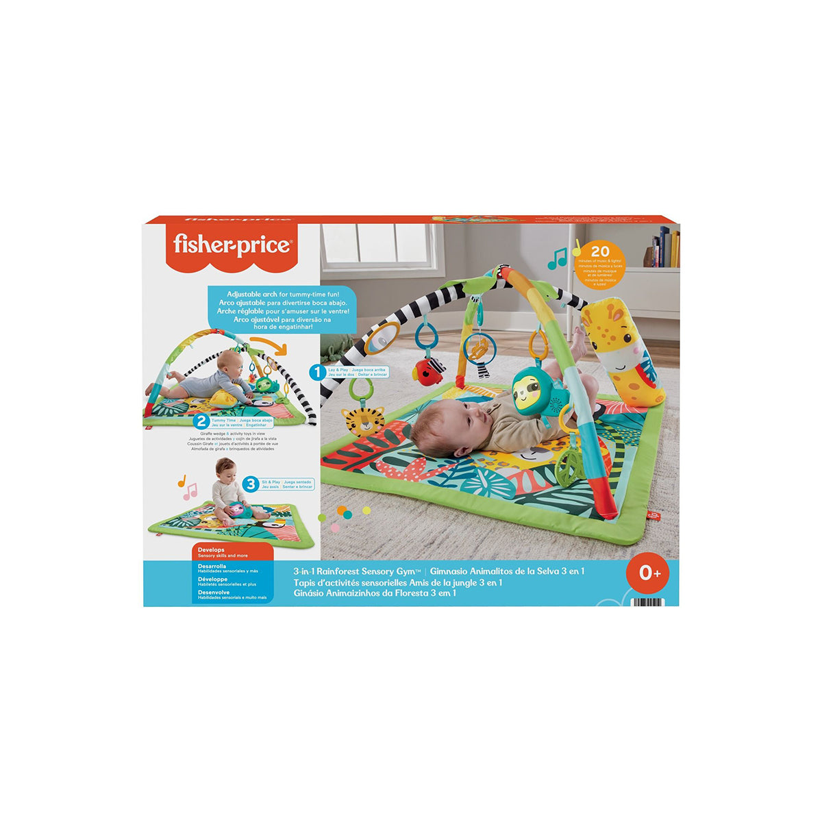 The Fisher-Price 3-in-1 Rainforest Sensory Gym grows with your baby from newborn to toddler, offering wild sensory delights along the way. Newborns can lay on the soft playmat with 6 toys hanging on the arches overhead. For tummy time, the adjustable arch can slide down to bring the toys within reach while the giraffe wedge helps support your baby as they play. Plus, the Music & Lights Sloth toy keeps playtime exciting as your baby grows from tummy time to sit-at and travel play.