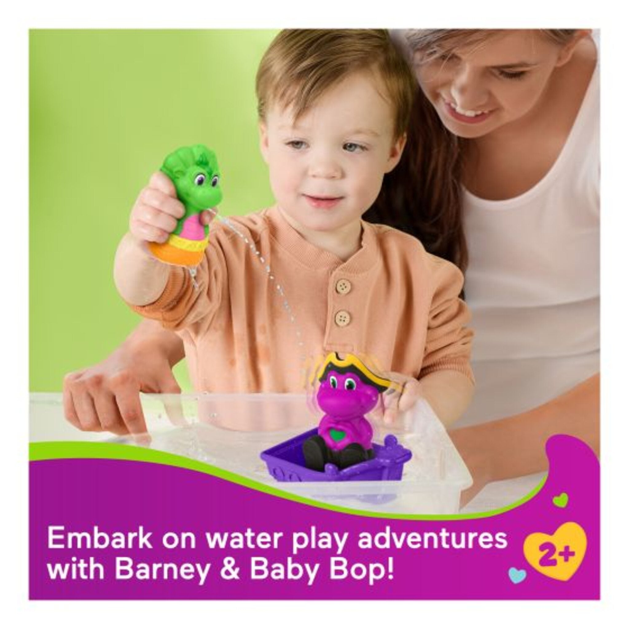 Kids can sail into exciting water play adventures with Barney and this 4-piece pirate ship set from Fisher-Price! Inspired by the Barney's World series, the floatable Water Fun Pirate Ship comes with Barney and Baby Bop water squirters -- Barney is dressed up as a pirate, and Baby Bop is dressed up as a mermaid!