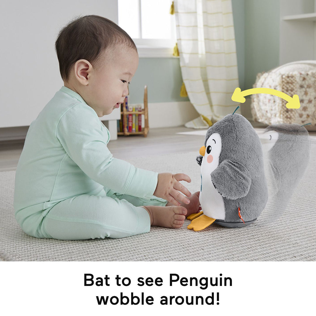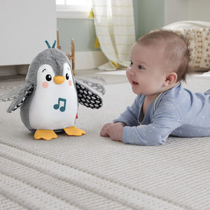 Tummy time is a flapping good time with the Fisher-Price Flap Wobble Penguin plush musical toy. This friendly faced tummy time toy responds to your baby’s touch with fun flapping motions and music. As your baby grows, the penguin’s roly-poly base encourages your little one to sit and bat their buddy for more fun tunes and wobbly, flapping action. High-contrast black white patterns, soft plush fabric, crinkly feet and playful music help foster your newborn’s developing visual, tactile and auditory senses.