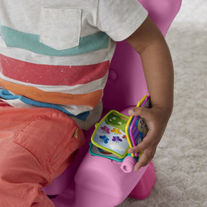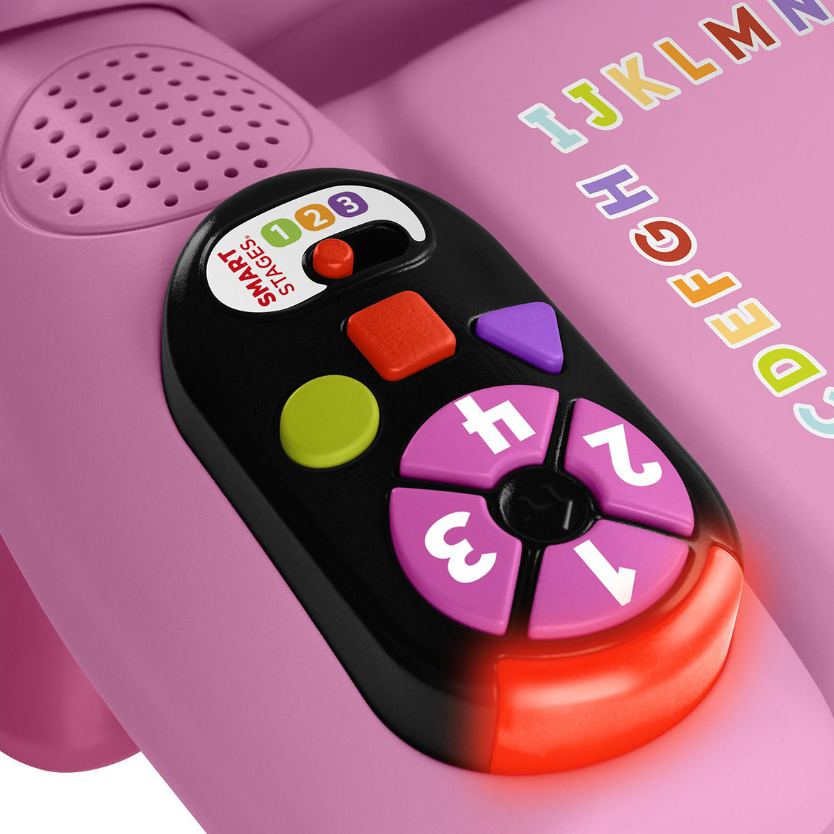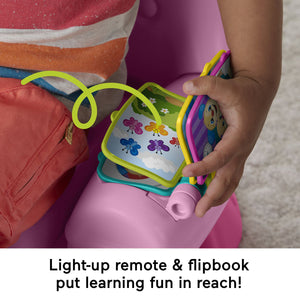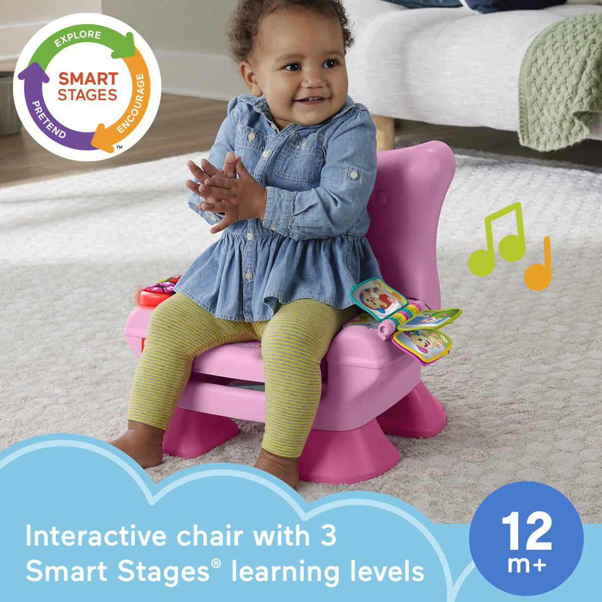 The Laugh & Learn Smart Stages Chair from Fisher-Price is your baby's very own spot to get cozy, play and discover. The interactive seat knows when little ones sit down or stand up, so the chair can respond with fun songs & phrases! As they take a seat, babies and toddlers have lots of fun activities to explore, including a light-up remote with number & shape buttons, a flipbook, and a lift-up cushion with hidden surprises.