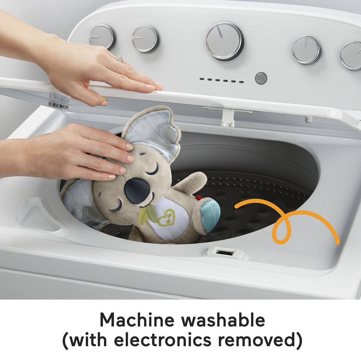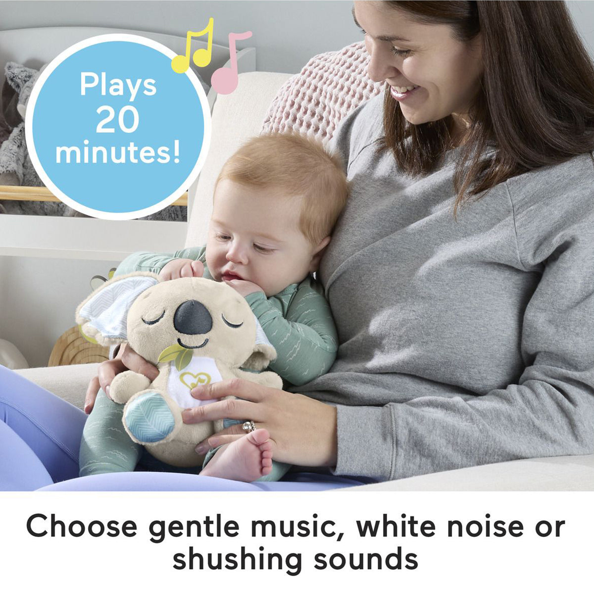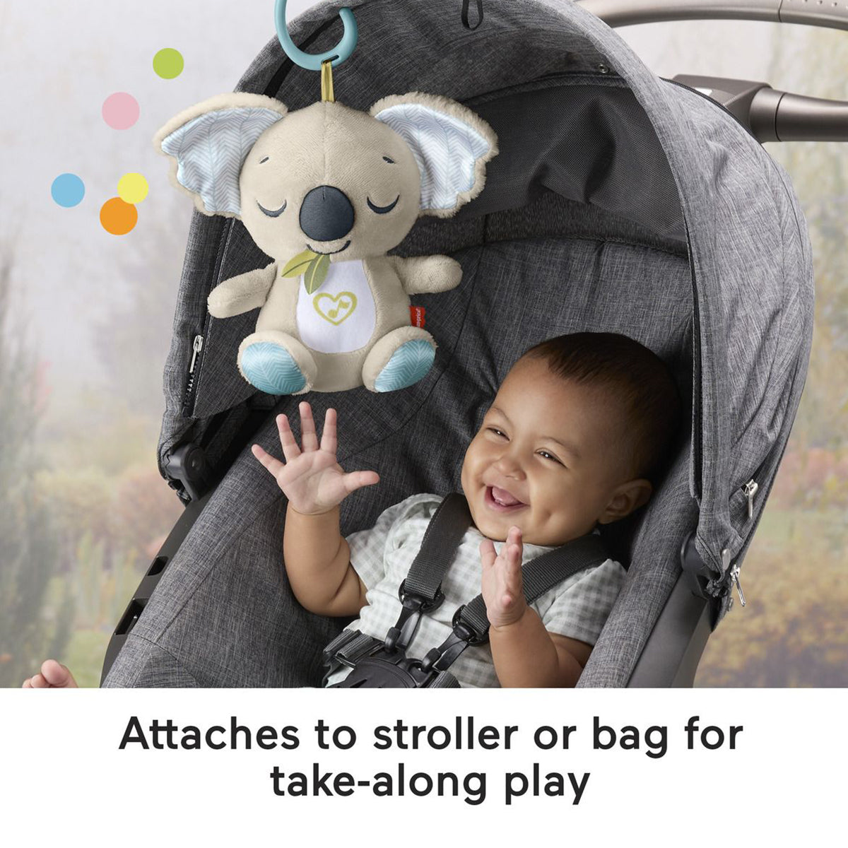 Baby can settle in for comforting cuddles, at home or on the go, with the On-the-Go Koala Soother plush toy from Fisher-Price. Styled like an adorable koala, this customizable portable sound machine plays up to 20 minutes of gentle music, white noise, or shushing sounds to calm your newborn the way they like best.