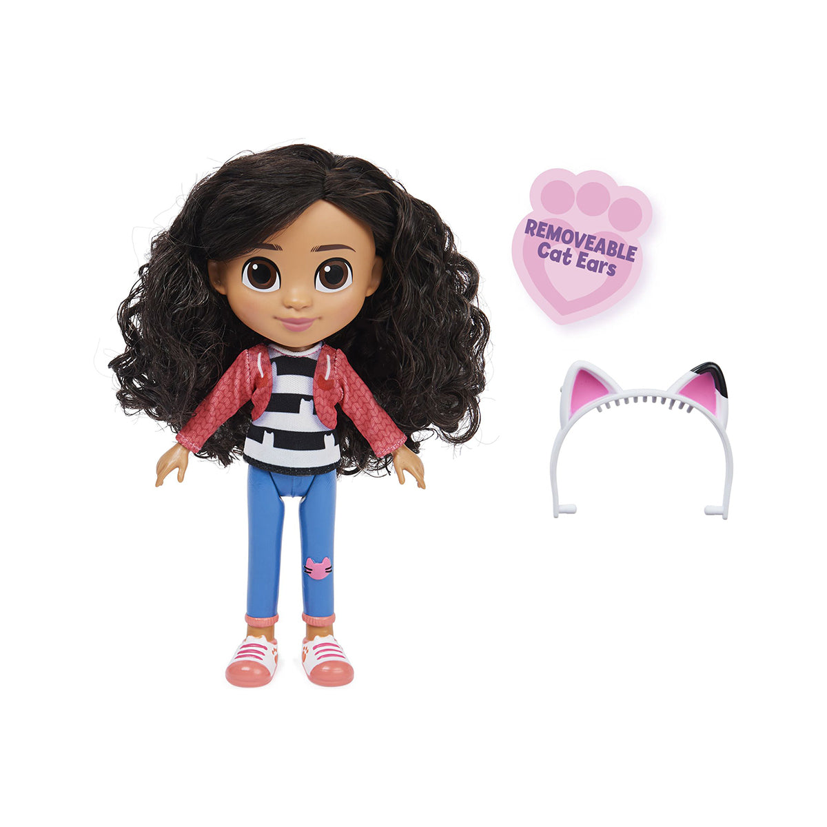Hang out with Gabby from Gabby’s Dollhouse with the all-new Gabby Girl doll. Featuring realistic details from head to toe, this 20.3-cm doll brings Gabby to life. Gabby Girl wears her classic outfit from the show, including trainers, jeans with a kitty patch, a fabric top and her signature cat ears. Her cat ears headband is removable and she even has soft and curly hair that you can style.