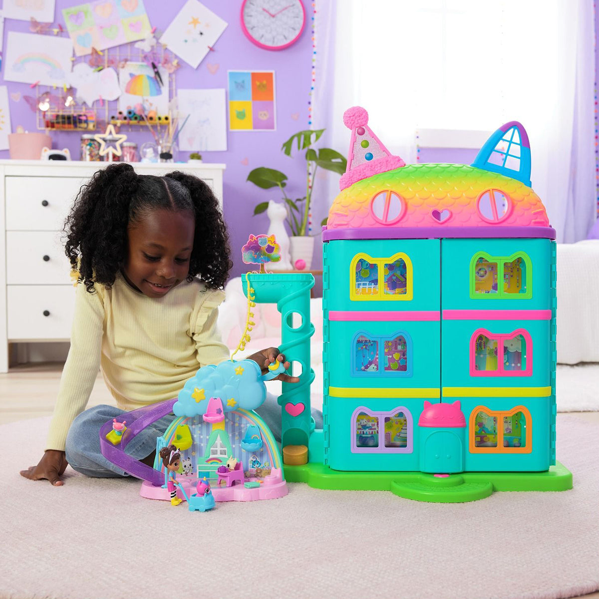 Create exciting babysitting adventures with Gabby and the baby kitties in the Kitty Care Ear Purrfect Playroom. This 17-piece playset features a Gabby girl figure, 3 baby kitties and a nursery playset that’s full of surprises. Take turns going down the slide, enjoy walks in the pushcart, use the high chair at mealtimes, then unbox a dollhouse delivery to discover a surprise toy before scanning the QR code in the delivery to unlock a reward in the Gabby’s Dollhouse App. After playtime, tuck them into their bassinets and rock them to sleep.