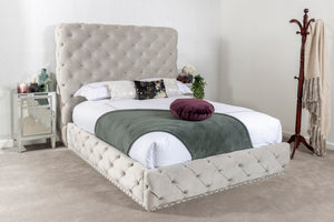 The Hamilton Bed Frame is handmade and has been crafted with a robust, strong internal frame which is finished with central support legs and a durable wooden slatted base, to give extra support and comfort to your mattress. The wide range of the most luxurious fabrics, studs and feet for you to choose from, allowing you to design the perfect bed frame you have always wanted. Needing extra storage? Look no further, we also given you the option to upgrade your standard bed frame to an ottoman storage bed, as shown on the images, ideal for keeping belongings neatly away. Please be aware, due to the sheer size of the headboard and foot end, this may not fit into all properties with a narrow staircase/hallway that have tight corners or high banisters.