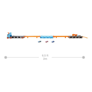 The Hot Wheels Speedway Hauler redefines Hot Wheels storage and racing in one very cool semi-truck that's full of surprises. Small display windows on the trailer showcase the more than 20 Hot Wheels cars it can carry, and when kids pull the back latch, the hauler unfolds into a six-foot long racetrack!