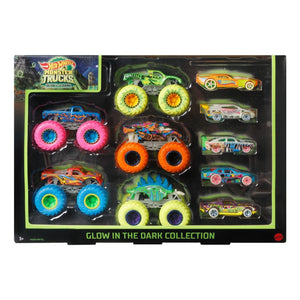 With 10 vehicles together, this set of Hot Wheels Monster Trucks Glow in the Dark is an instant collection! Five die-cast monster trucks and five 1:64 scale die-cast cars provide endless smashing and crashing play - with the lights on or off! Glow-in-the-dark elements bring a new edge to "light speed." Kids can collect other Monster Trucks vehicles and toys for even more stunting, racing and battling play! Makes a great gift for kids 4 to 8 years old, especially monster trucks fans! Colours and decorations may vary.
