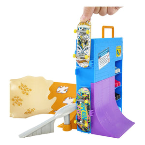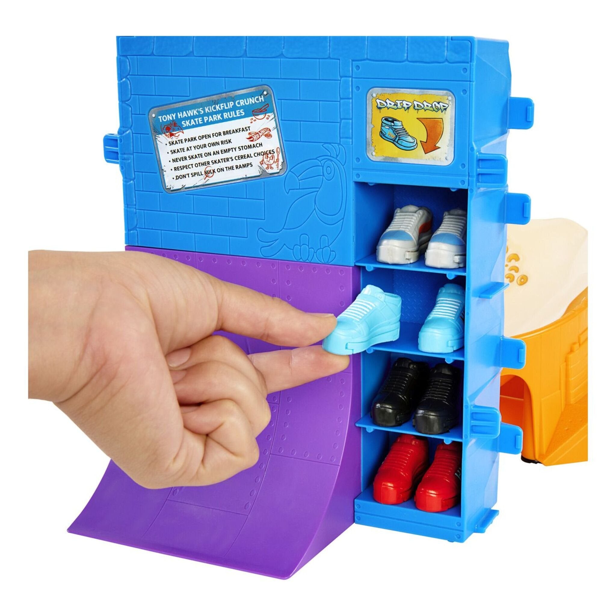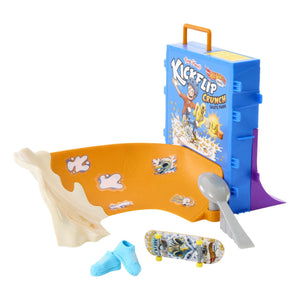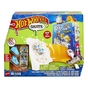 Shred through an epic bowl of cereal with the Hot Wheels Skate Tony Hawk Cereal Skate Bowl. Created in collaboration with skateboarding legend Tony Hawk, this cereal-themed skate set invites fingerboarders to skate through a cereal bowl, perform vert tricks on the cereal box before grinding the rail at the top for a surprise trophy reveal. Ride the back ramp and grind the spoon rail for extra flair! It includes one exclusive fingerboard and removable pair of skate shoes with storage for four boards and four pairs of shoes. (Additional boards and shoes sold separately.) Colors and decorations may vary.