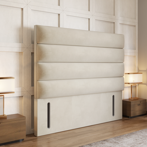 The Infinity Headboard presents a straightforward design with a distinct visual element. It features a surface marked by consistent horizontal lines. These lines run across the width of the headboard, creating a repeated pattern. This pattern adds a simple, linear texture to the bedroom.