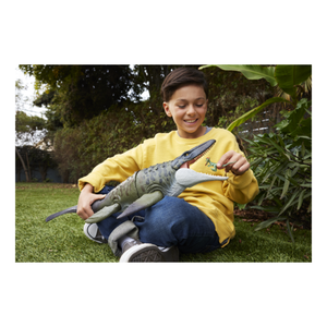 This Bite 'N Blast Mosasaurus dinosaur action figure with its distinctive aquatic design brings the excitement of Jurassic World Rebirth home. A button-activated 'Bite' feature allows dramatic re-enactment of movie scenes and inspires creative play. Kids can control the attack by holding the tail and pressing the button to make the jaw open wide to bite the mini Dilophosaurus figure that's included can be completely 'swallowed' into the large Mosasaurus body!
