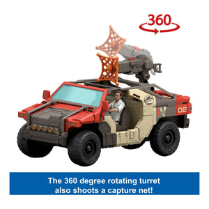 This Jurassic World Rebirth Launch 'N Battle Vehicle, inspired by the excitement of the movie, is ready for adventure with a detachable turret with blaster. It launches either a DNA sample-collecting dart or a net projectile. A Jurassic World Rebirth Velociraptor and Martin Krebs figure are also included for storytelling possibilities.