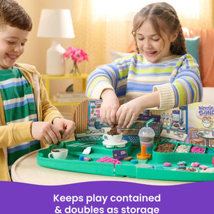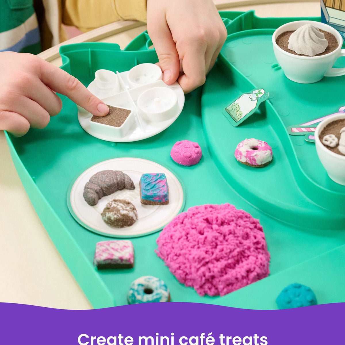 Flow sand into a cappuccino cup and top with moulded whipped cream or a latte art stamp; layer sand in the frappe cup and top with grated sprinkles; mould mini treats croissants, donuts and other shapes, then create again and again. The Café Case keeps sand contained and after play, closes for easy storage.