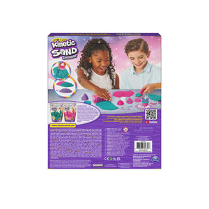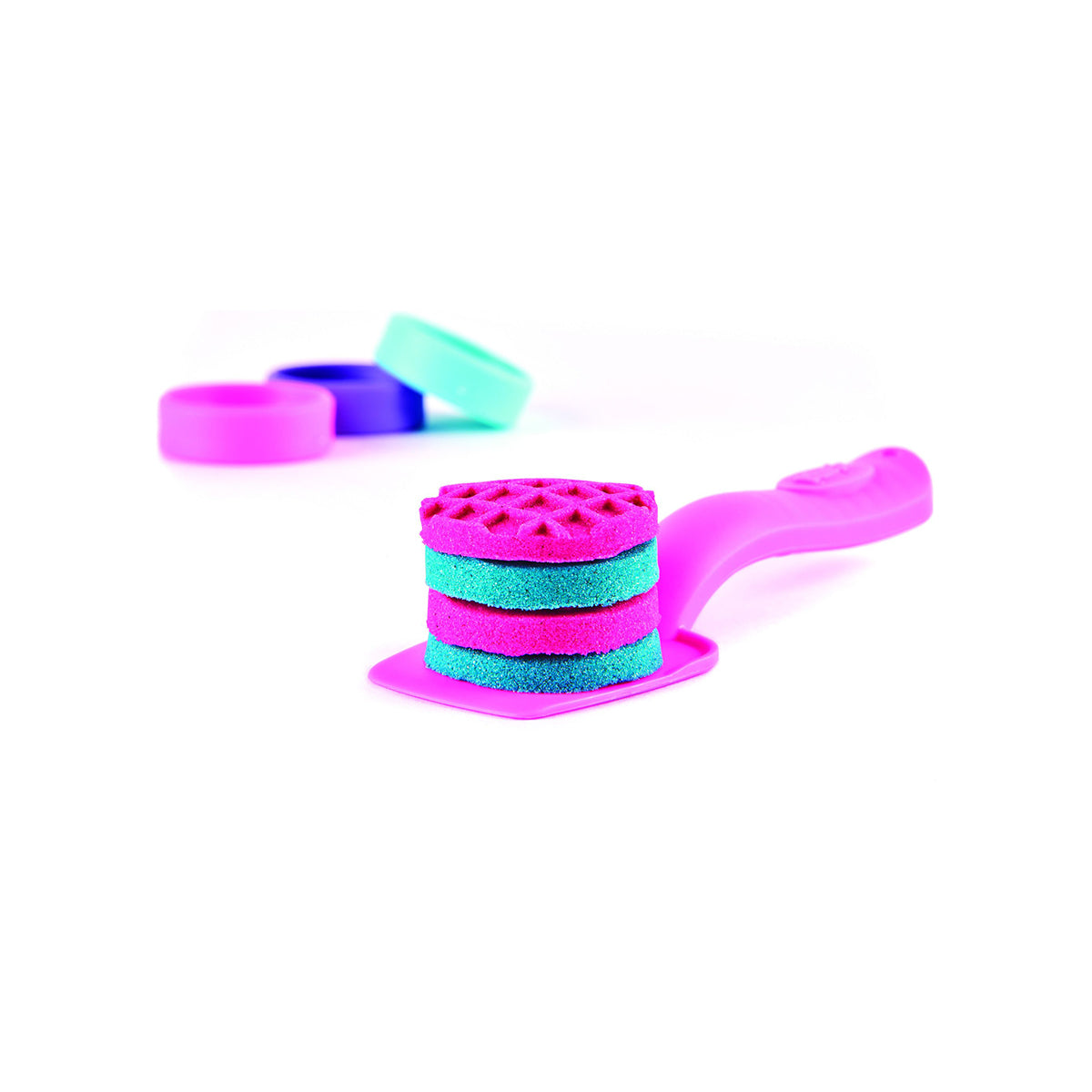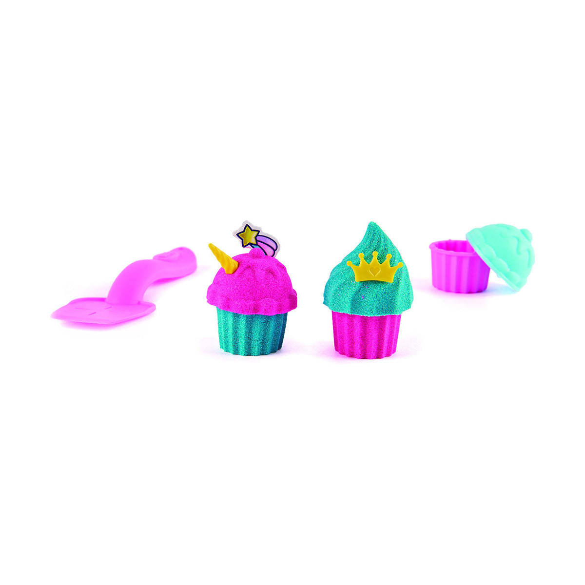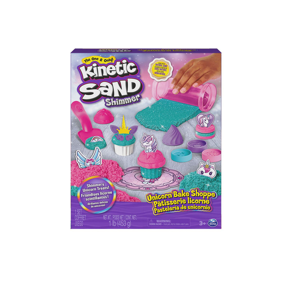 Run the ultimate Kinetic Sand Unicorn Bake Shoppe. This playset features 453g of Kinetic Sand: 226g of shimmer teal and 226g of pink neon sand. Create unicorn cupcakes with the moulds and tools. This set includes 3 cupcake moulds, roller, spatula and 6 unicorn-themed accessories.