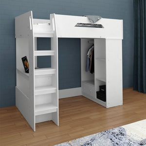 The high sleeper is the ultimate functional bedroom furniture for kids and teenagers. Finished in white, the bed features an incredibly practical hanging area with an integral storage drawer, which really maximizes the space available within its compact footprint. To the side of this is a tall 3 shelved area with enough room for ample items. The fitted desk on the other side is an ideal work station for you child to work at. The robust ladder is located at the front of the bed with grip handles at the top for when climbing up. Features