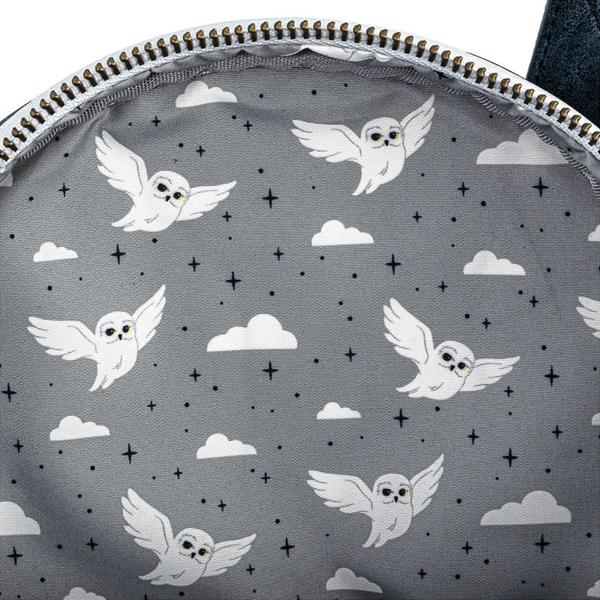 - Features Hedwig, gold foil, applique, and zipper charm
