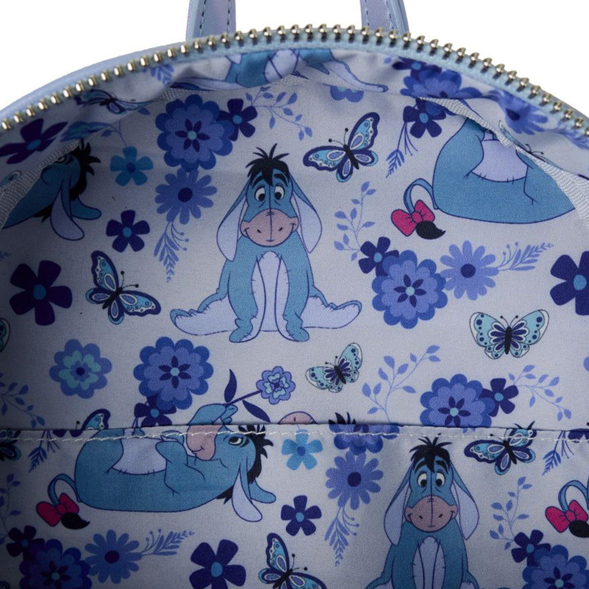 Is there anything cuter than a floral Eeyore moment?! This mini backpack features Eeyore amongst the flowers with a butterfly resting on his nose! Metal rivets allow you to spin the flowers on the front pocket. Embroidery and iridescent details uplevel this bag and make it stand out. For spring, summer, and beyond, this bag is a super cute accessory for any season!