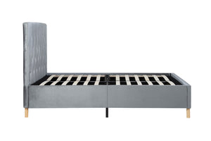 The Loxley bed frame is upholstered in polyester with complementary light feet and is available in mustard, grey, green and blue.