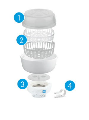 Sterilises up to 6 bottles and accessories in one go. Easy switch to microwave steriliser making travelling lighter. Includes a soother; bottle & teat tongs. Gentle and express bottle warming. Defrost & keep warm function.