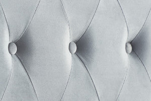 - The Marquis bed, also available as an ottoman, is upholstered in a luxurious grey velvet and features a beautiful tufted detailing headboard