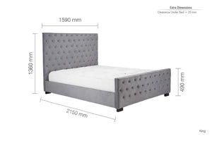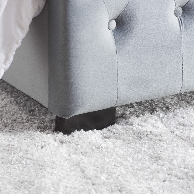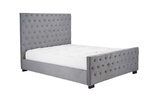 The Marquis bed is upholstered in a luxurious grey velvet and features a beautiful tufted detailing headboard.